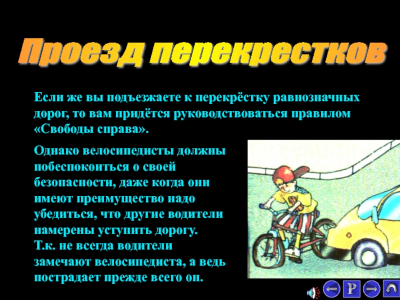 Однако велосипедисты должны побеспокоиться о своей безопасности, даже когда они имеют преимущество надо убедиться, что другие водители намерены уступить дорогу.