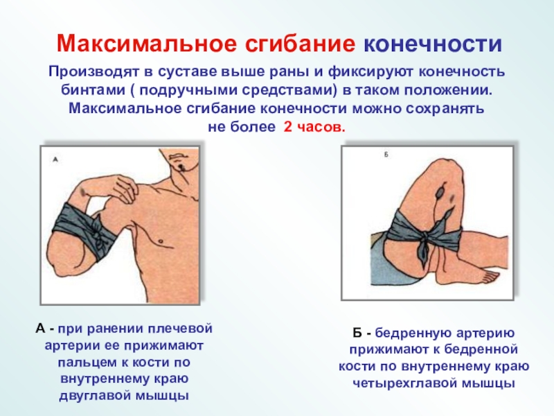 А - при ранении плечевой артерии ее прижимают пальцем к кости по внутреннему краю двуглавой мышцы