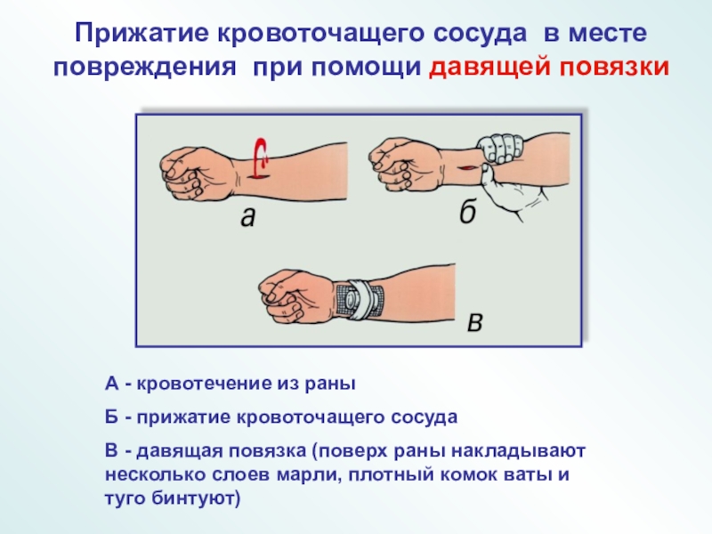 Прижатие кровоточащего сосуда в месте повреждения при помощи давящей повязки