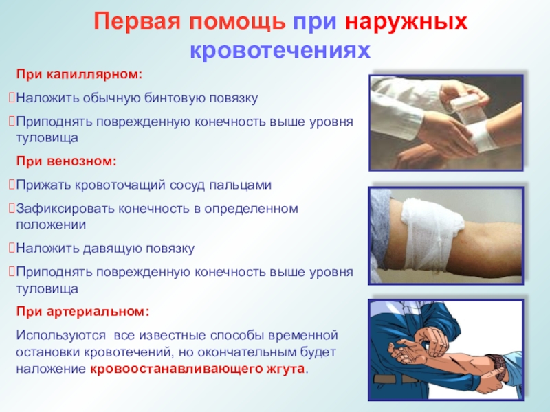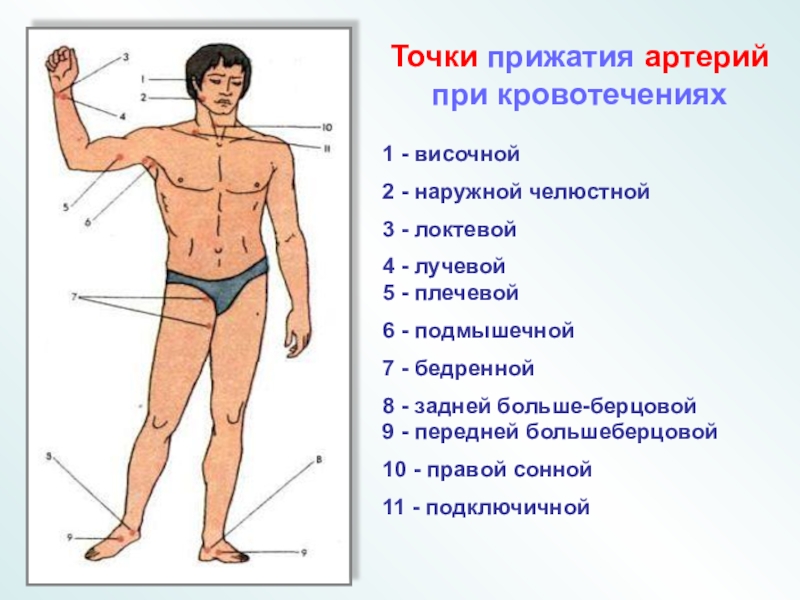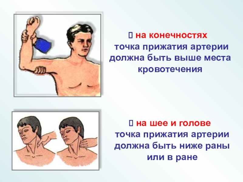 точка прижатия артерии должна быть выше места кровотечения