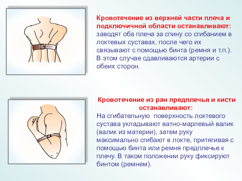 На сгибательную поверхность локтевого сустава укладывают ватно-марлевый валик (валик из материи), затем руку максимально сгибают в локте, притягивая с помощью бинта или ремня предплечье к плечу. В таком положении руку фиксируют бинтом (ремнем).