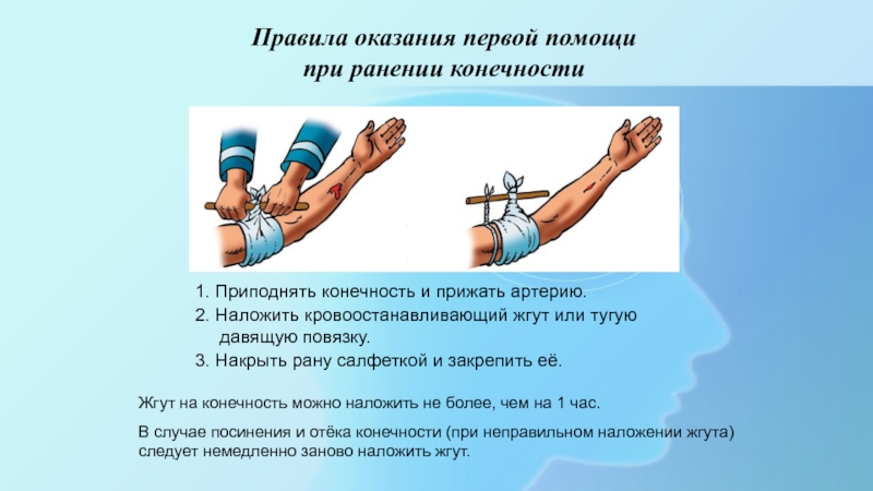 В случае посинения и отёка конечности (при неправильном наложении жгута) следует немедленно заново наложить жгут.