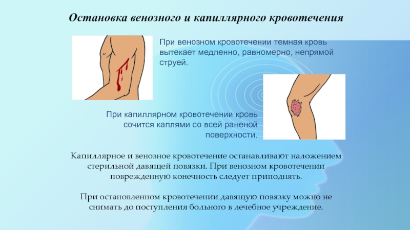 При венозном кровотечении темная кровь вытекает медленно, равномерно, непрямой струей.