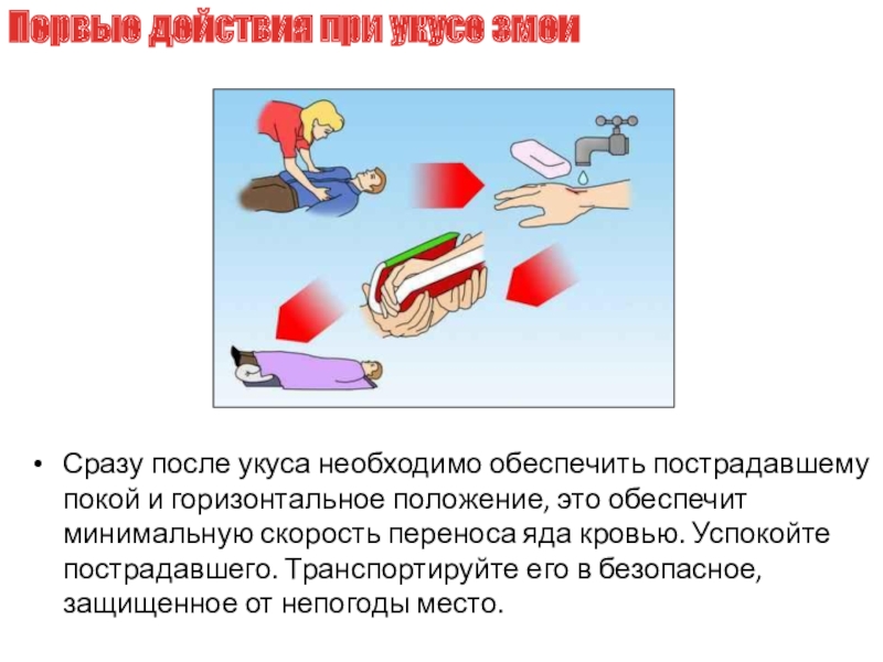 Слайд 7Сразу после укуса необходимо обеспечить пострадавшему покой и горизонтальное положение, это