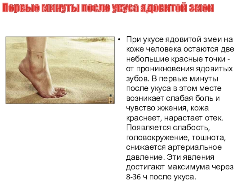 Слайд 6При укусе ядовитой змеи на коже человека остаются две небольшие красные