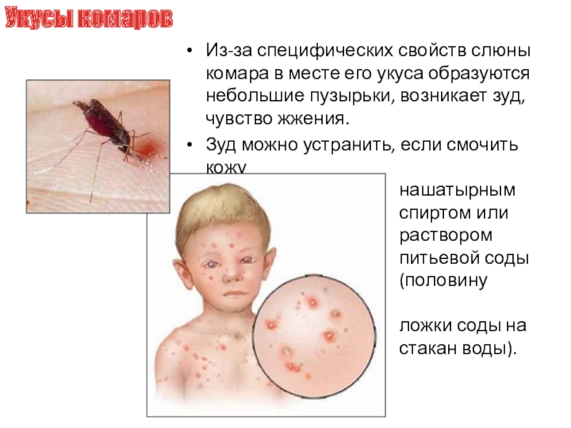 Слайд 16Из-за специфических свойств слюны комара в месте его укуса образуются небольшие