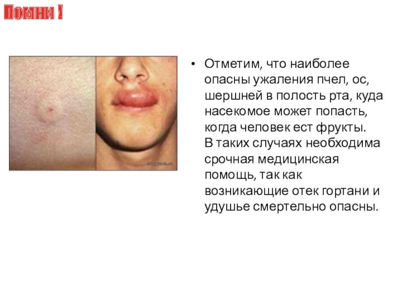 Слайд 15Отметим, что наиболее опасны ужаления пчел, ос, шершней в полость рта,