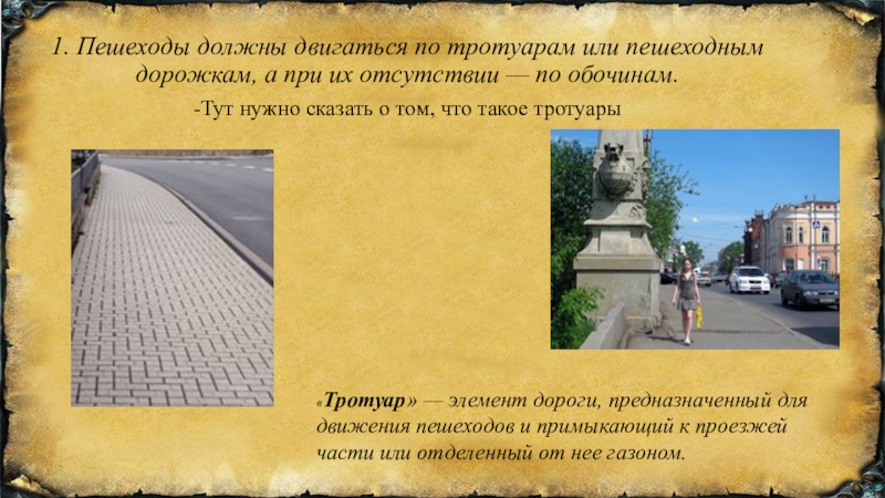 «Тротуар» — элемент дороги, предназначенный для движения пешеходов и примыкающий к проезжей части или отделенный от нее газоном.