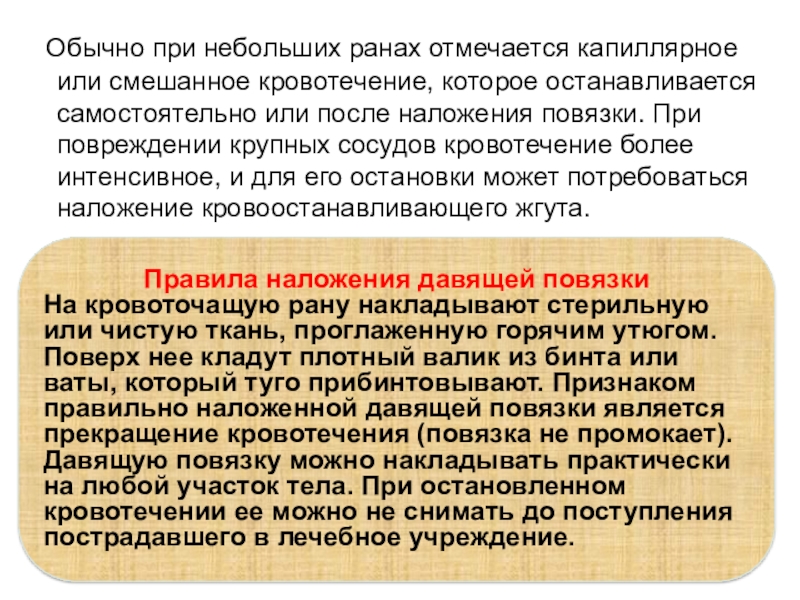 На кровоточащую рану накладывают стерильную или чистую ткань, проглаженную горячим утюгом. Поверх нее кладут плотный валик из бинта или ваты, который туго прибинтовывают. Признаком правильно наложенной давящей повязки является прекращение кровотечения (повязка не промокает). Давящую повязку можно накладывать практически на любой участок тела. При остановленном кровотечении ее можно не снимать до поступления пострадавшего в лечебное учреждение.