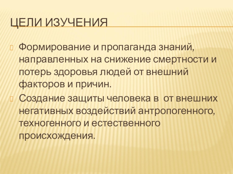 Создание защиты человека в от внешних негативных воздействий антропогенного, техногенного и естественного происхождения.
