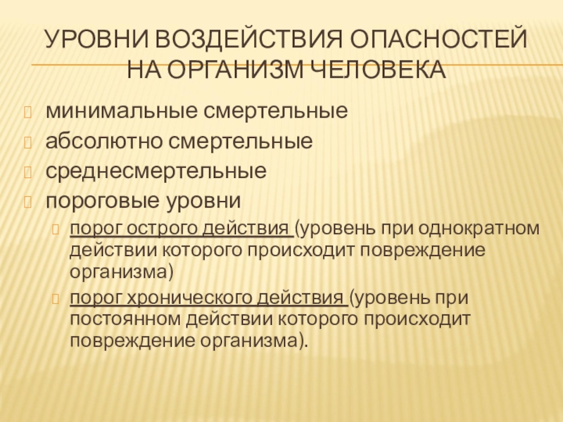 Слайд 28УРОВНИ ВОЗДЕЙСТВИЯ ОПАСНОСТЕЙ