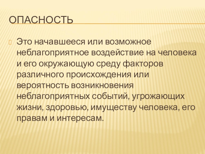 среду факторов различного происхождения или вероятность возникновения неблагоприятных событий, угрожающих жизни, здоровью, имуществу человека, его правам и интересам.