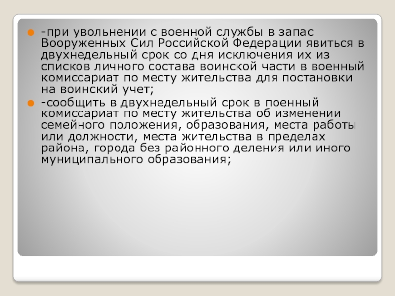 -сообщить в двухнедельный срок в поенный комиссариат по месту жительства об изменении семейного положения, образования, места работы или должности, места жительства в пределах района, города без районного деления или иного муниципального образования;