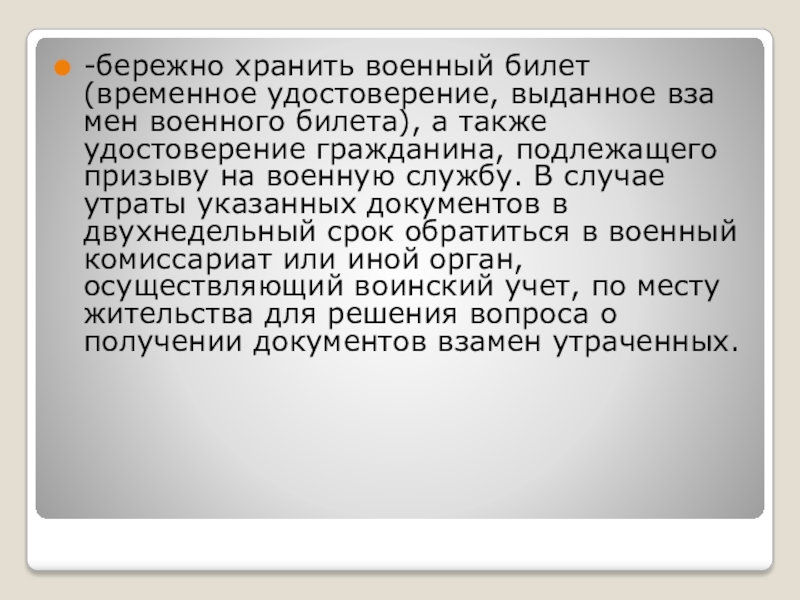 Слайд 34-бережно хранить военный билет (временное удостоверение, выданное взамен военного билета), а