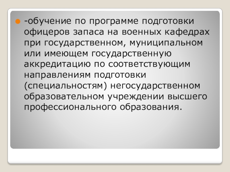 Слайд 43-обучение по программе подготовки офицеров запаса на военных кафедрах при государственном,