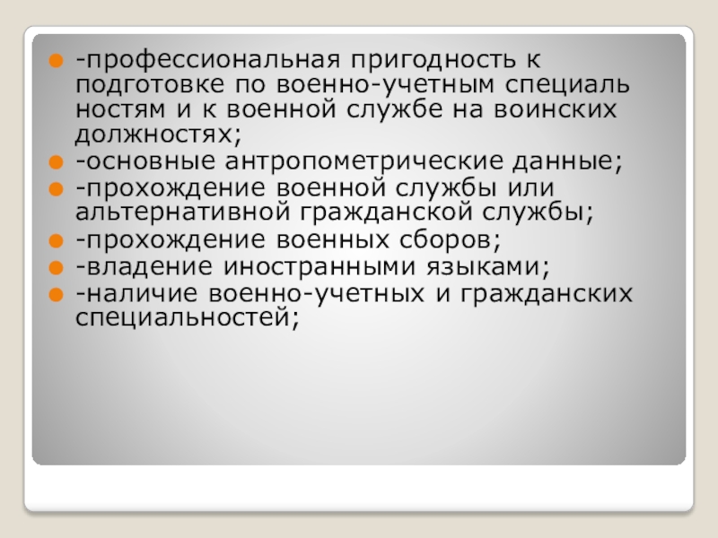 Слайд 17-профессиональная пригодность к подготовке по военно-учетным специальностям и к военной службе