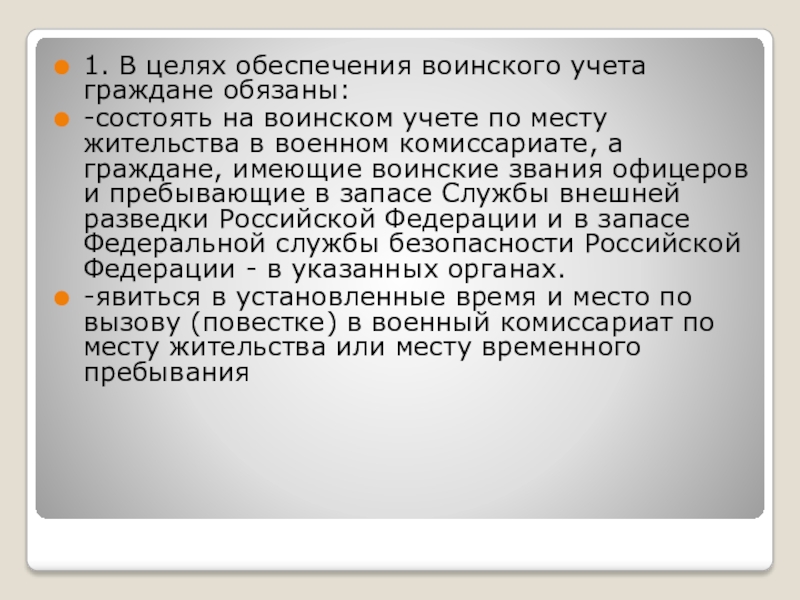 Слайд 311. В целях обеспечения воинского учета граждане обязаны: