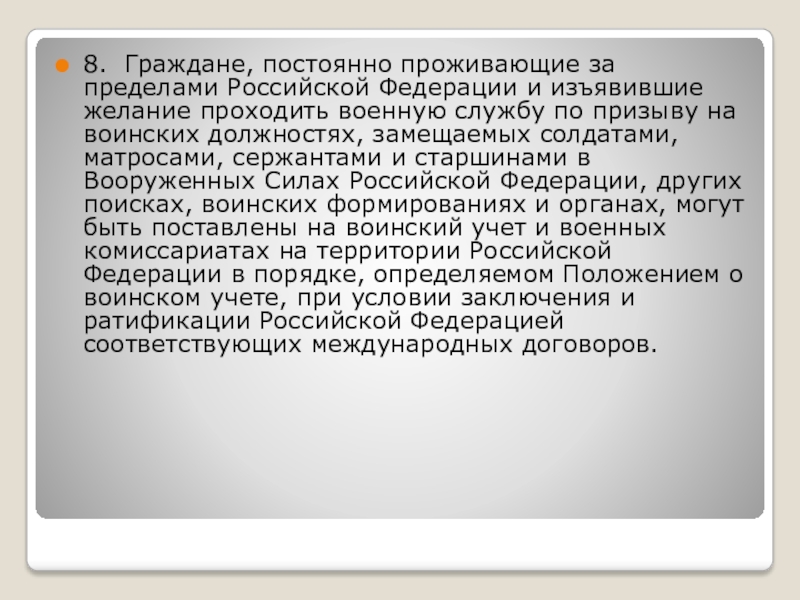 проходить военную службу по призыву на воинских должностях, замещаемых солдатами, матросами, сержантами и старшинами в Вооруженных Силах Российской Федерации, других поисках, воинских формированиях и органах, могут быть поставлены на воинский учет и военных комиссариатах на территории Российской Федерации в порядке, определяемом Положением о воинском учете, при условии заключения и ратификации Российской Федерацией соответствующих международных договоров.