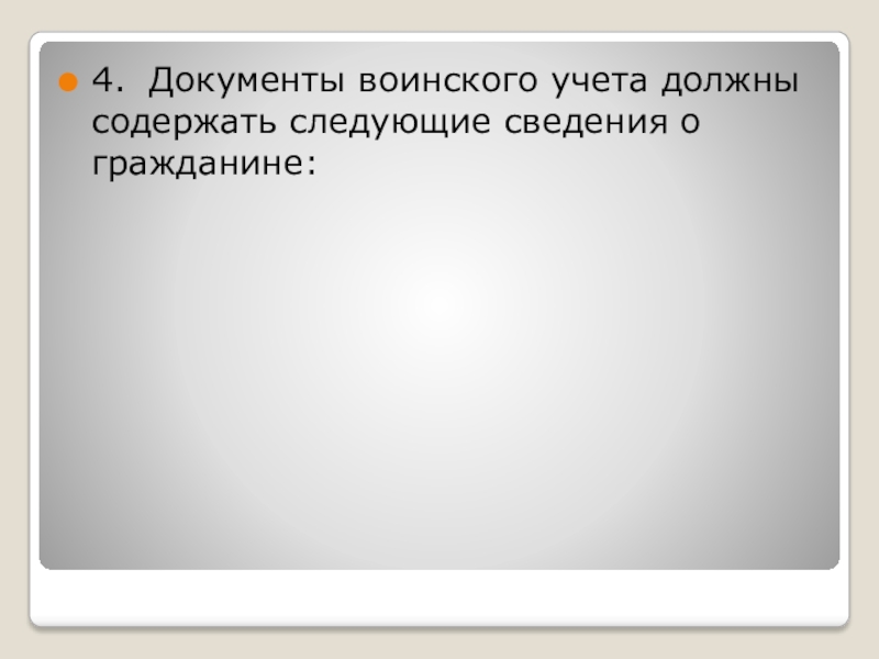 Слайд 154. Документы воинского учета должны содержать следующие сведения о гражданине: