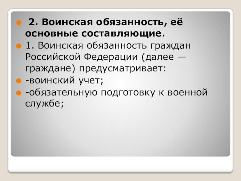 Слайд 4 2. Воинская обязанность, её основные составляющие.