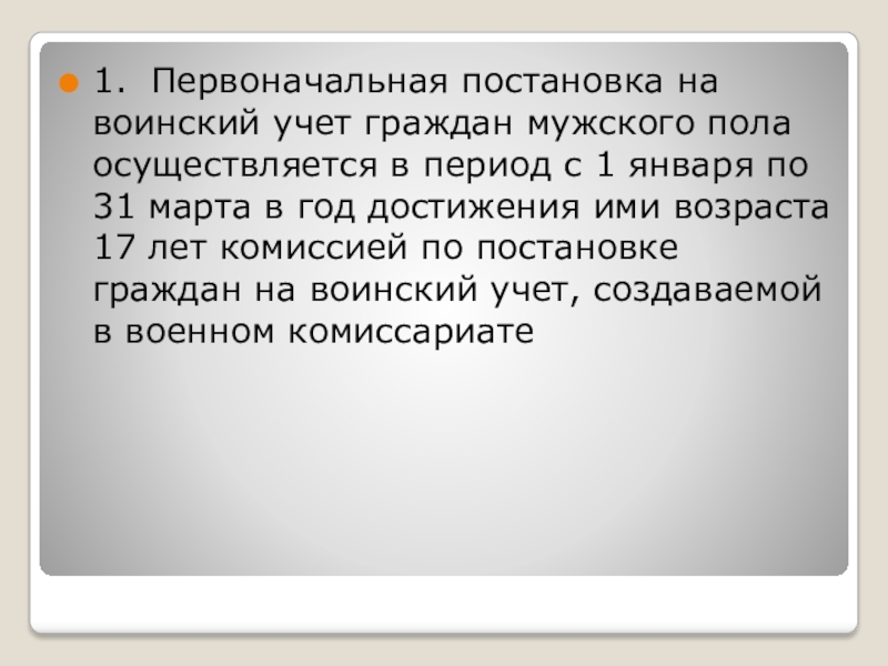 Слайд 231. Первоначальная постановка на воинский учет граждан мужского пола осуществляется в