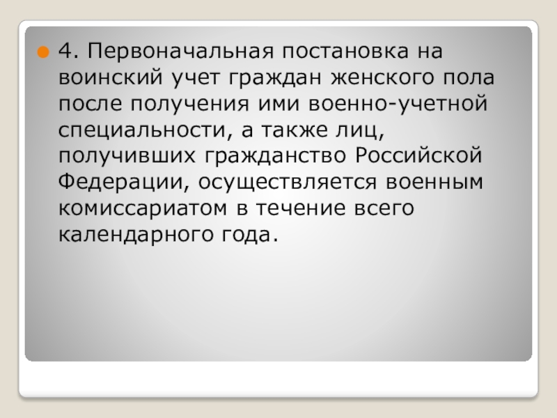 Слайд 264. Первоначальная постановка на воинский учет граждан женского пола после получения