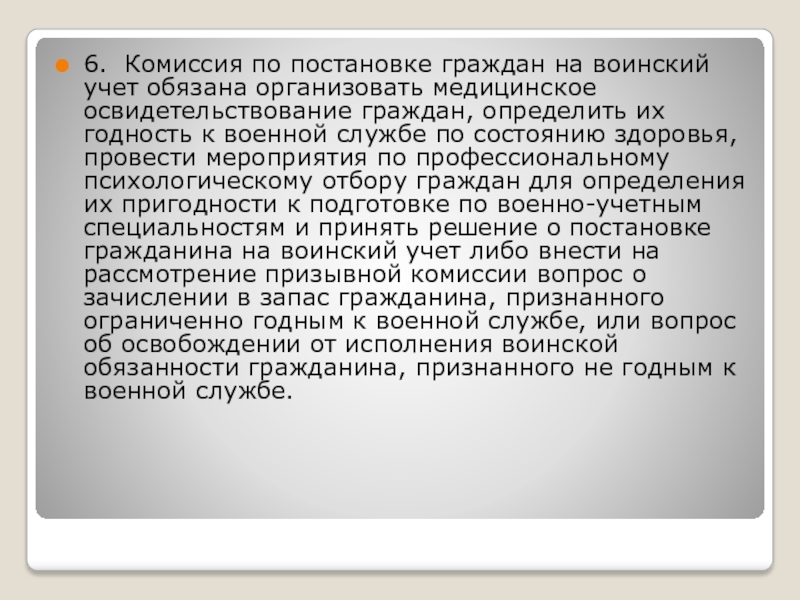 освидетельствование граждан, определить их годность к военной службе по состоянию здоровья, провести мероприятия по профессиональному психологическому отбору граждан для определения их пригодности к подготовке по военно-учетным специальностям и принять решение о постановке гражданина на воинский учет либо внести на рассмотрение призывной комиссии вопрос о зачислении в запас гражданина, признанного ограниченно годным к военной службе, или вопрос об освобождении от исполнения воинской обязанности гражданина, признанного не годным к военной службе.