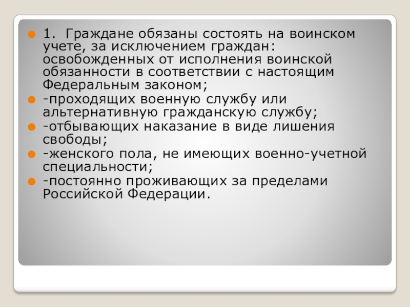 Слайд 121. Граждане обязаны состоять на воинском учете, за исключением граждан: освобожденных