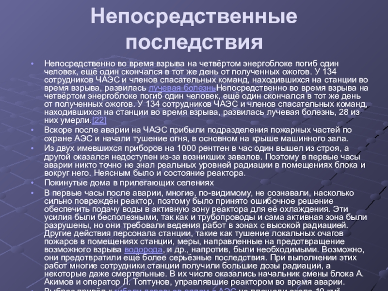 ещё один скончался в тот же день от полученных ожогов. У 134 сотрудников ЧАЭС и членов спасательных команд, находившихся на станции во время взрыва, развилась лучевая болезньНепосредственно во время взрыва на четвёртом энергоблоке погиб один человек, ещё один скончался в тот же день от полученных ожогов. У 134 сотрудников ЧАЭС и членов спасательных команд, находившихся на станции во время взрыва, развилась лучевая болезнь, 28 из них умерли.[22]