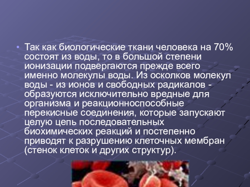 в большой степени ионизации подвергаются прежде всего именно молекулы воды. Из осколков молекул воды - из ионов и свободных радикалов - образуются исключительно вредные для организма и реакционноспособные перекисные соединения, которые запускают целую цепь последовательных биохимических реакций и постепенно приводят к разрушению клеточных мембран (стенок клеток и других структур).