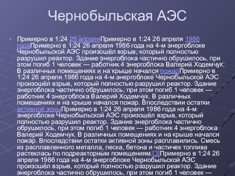 годаПримерно в 1:24 26 апреля 1986 года на 4-м энергоблоке Чернобыльской АЭС произошёл взрыв, который полностью разрушил реактор. Здание энергоблока частично обрушилось, при этом погиб 1 человек — работник 4 энергоблока Валерий Ходемчук. В различных помещениях и на крыше начался пожарПримерно в 1:24 26 апреля 1986 года на 4-м энергоблоке Чернобыльской АЭС произошёл взрыв, который полностью разрушил реактор. Здание энергоблока частично обрушилось, при этом погиб 1 человек — работник 4 энергоблока Валерий Ходемчук. В различных помещениях и на крыше начался пожар. Впоследствии остатки активной зоныПримерно в 1:24 26 апреля 1986 года на 4-м энергоблоке Чернобыльской АЭС произошёл взрыв, который полностью разрушил реактор. Здание энергоблока частично обрушилось, при этом погиб 1 человек — работник 4 энергоблока Валерий Ходемчук. В различных помещениях и на крыше начался пожар. Впоследствии остатки активной зоны расплавились. Смесь из расплавленного металла, песка, бетона и частичек топлива растеклась по подреакторным помещениям.[3]Примерно в 1:24 26 апреля 1986 года на 4-м энергоблоке Чернобыльской АЭС произошёл взрыв, который полностью разрушил реактор. Здание энергоблока частично обрушилось, при этом погиб 1 человек — работник 4 энергоблока Валерий Ходемчук. В различных помещениях и на крыше начался пожар. Впоследствии остатки активной зоны расплавились. Смесь из расплавленного металла, песка, бетона и частичек топлива растеклась по подреакторным помещениям.[3][4]Примерно в 1:24 26 апреля 1986 года на 4-м энергоблоке Чернобыльской АЭС произошёл взрыв, который полностью разрушил реактор. Здание энергоблока частично обрушилось, при этом погиб 1 человек — работник 4 энергоблока Валерий Ходемчук. В различных помещениях и на крыше начался пожар. Впоследствии остатки активной зоны расплавились. Смесь из расплавленного металла, песка, бетона и частичек топлива растеклась по подреакторным помещениям.[3][4] В результате аварии произошёл выброс радиоактивных веществПримерно в 1:24 26 апреля 1986 года на 4-м энергоблоке Чернобыльской АЭС произошёл взрыв, который полностью разрушил реактор. Здание энергоблока частично обрушилось, при этом погиб 1 человек — работник 4 энергоблока Валерий Ходемчук. В различных помещениях и на крыше начался пожар. Впоследствии остатки активной зоны расплавились. Смесь из расплавленного металла, песка, бетона и частичек топлива растеклась по подреакторным помещениям.[3][4] В результате аварии произошёл выброс радиоактивных веществ, в том числе изотоповПримерно в 1:24 26 апреля 1986 года на 4-м энергоблоке Чернобыльской АЭС произошёл взрыв, который полностью разрушил реактор. Здание энергоблока частично обрушилось, при этом погиб 1 человек — работник 4 энергоблока Валерий Ходемчук. В различных помещениях и на крыше начался пожар. Впоследствии остатки активной зоны расплавились. Смесь из расплавленного металла, песка, бетона и частичек топлива растеклась по подреакторным помещениям.[3][4] В результате аварии произошёл выброс радиоактивных веществ, в том числе изотопов уранаПримерно в 1:24 26 апреля 1986 года на 4-м энергоблоке Чернобыльской АЭС произошёл взрыв, который полностью разрушил реактор. Здание энергоблока частично обрушилось, при этом погиб 1 человек — работник 4 энергоблока Валерий Ходемчук. В различных помещениях и на крыше начался 