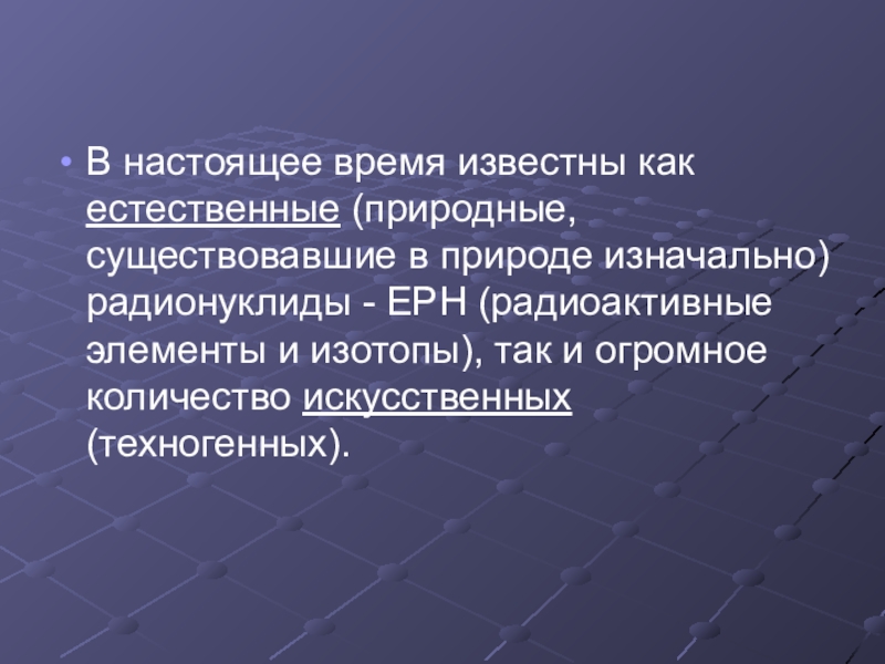 радионуклиды - ЕРН (радиоактивные элементы и изотопы), так и огромное количество искусственных (техногенных).