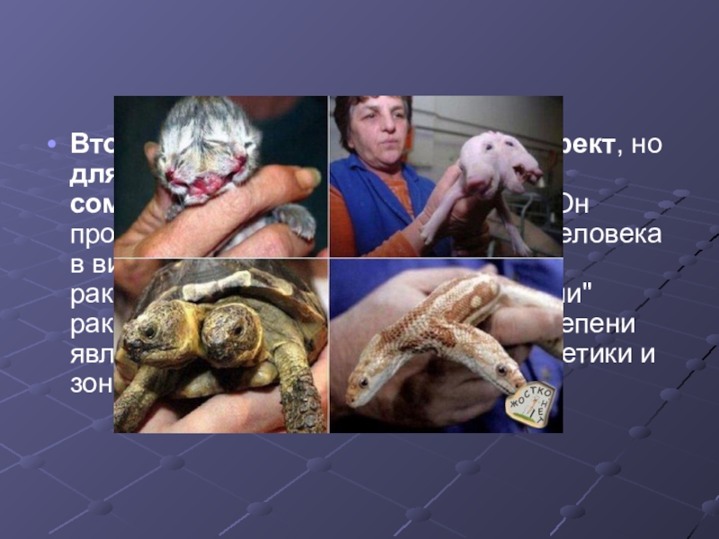 Первый - это генетический эффект для наследственных (половых) клеток организма. Он может проявиться и проявляется только в потомстве. Это рождение детей с различными отклонениями от нормы (уродства разной степени, слабоумие и т. д.), либо рождение полностью нежизнеспособного плода, - с отклонениями, не совместимыми с жизнью.