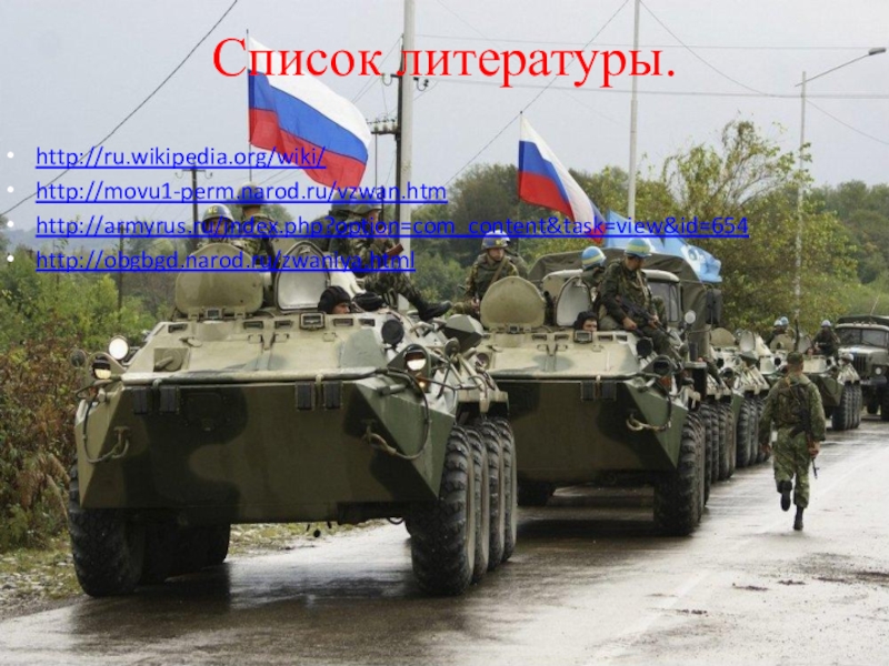 Список литературы.http://ru.wikipedia.org/wiki/http://movu1-perm.narod.ru/vzwan.htmhttp://armyrus.ru/index.php?option=com_content&task=view&id=654http://obgbgd.narod.ru/zwaniya.html