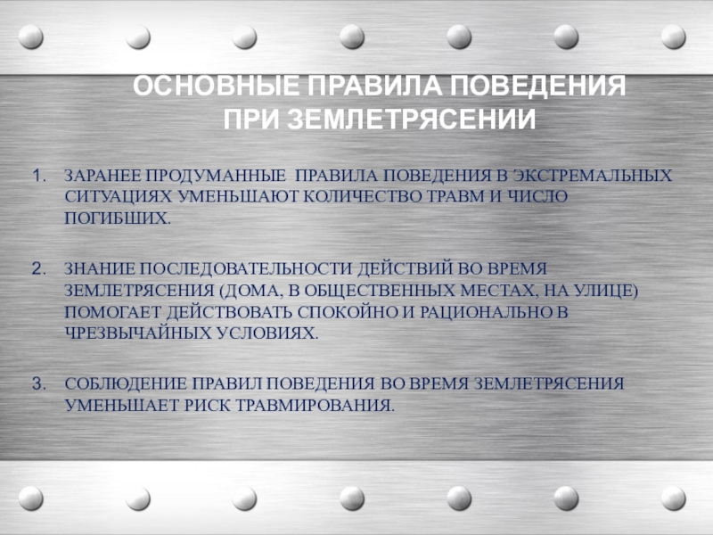 ЗНАНИЕ ПОСЛЕДОВАТЕЛЬНОСТИ ДЕЙСТВИЙ ВО ВРЕМЯ ЗЕМЛЕТРЯСЕНИЯ (ДОМА, В ОБЩЕСТВЕННЫХ МЕСТАХ, НА УЛИЦЕ) ПОМОГАЕТ ДЕЙСТВОВАТЬ СПОКОЙНО И РАЦИОНАЛЬНО В ЧРЕЗВЫЧАЙНЫХ УСЛОВИЯХ.