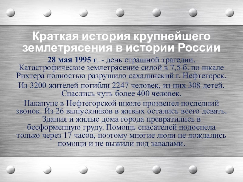 - день страшной трагедии. Катастрофическое землетрясение силой в 7,5 б. по шкале Рихтера полностью разрушило сахалинский г. Нефтегорск.