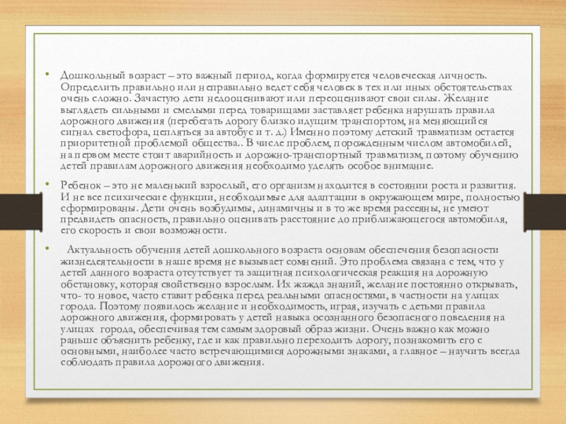 правильно или неправильно ведет себя человек в тех или иных обстоятельствах очень сложно. Зачастую дети недооценивают или переоценивают свои силы. Желание выглядеть сильными и смелыми перед товарищами заставляет ребенка нарушать правила дорожного движения (перебегать дорогу близко идущим транспортом, на меняющийся сигнал светофора, цепляться за автобус и т. д.) Именно поэтому детский травматизм остается приоритетной проблемой общества.. В числе проблем, порожденным числом автомобилей, на первом месте стоит аварийность и дорожно-транспортный травматизм, поэтому обучению детей правилам дорожного движения необходимо уделять особое внимание.