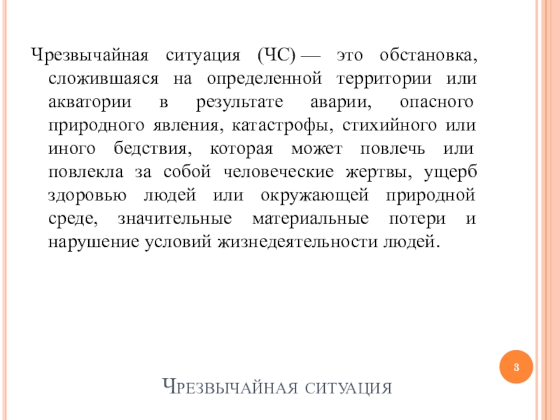 Чрезвычайная ситуация (ЧС) — это обстановка, сложившаяся на определенной территории или