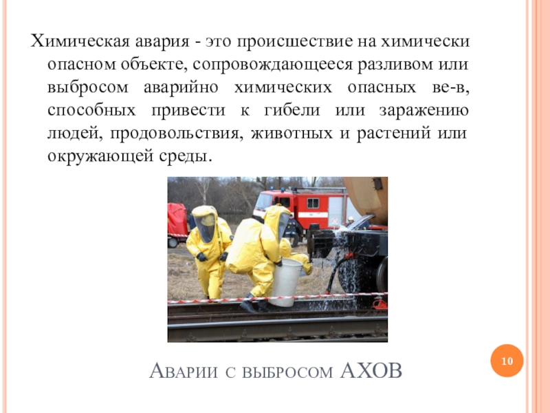 сопровождающееся разливом или выбросом аварийно химических опасных ве-в, способных привести к гибели или заражению людей, продовольствия, животных и растений или окружающей среды.