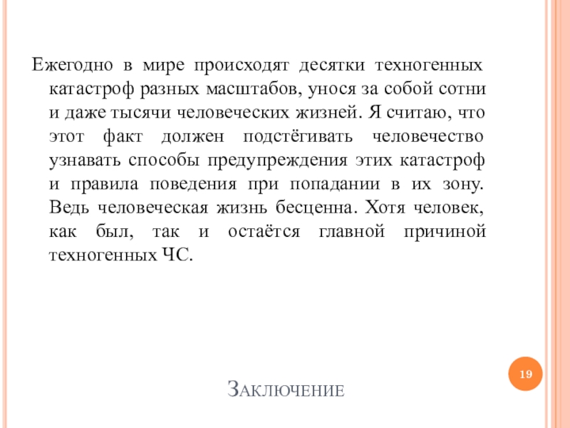 собой сотни и даже тысячи человеческих жизней. Я считаю, что этот факт должен подстёгивать человечество узнавать способы предупреждения этих катастроф и правила поведения при попадании в их зону. Ведь человеческая жизнь бесценна. Хотя человек, как был, так и остаётся главной причиной техногенных ЧС.