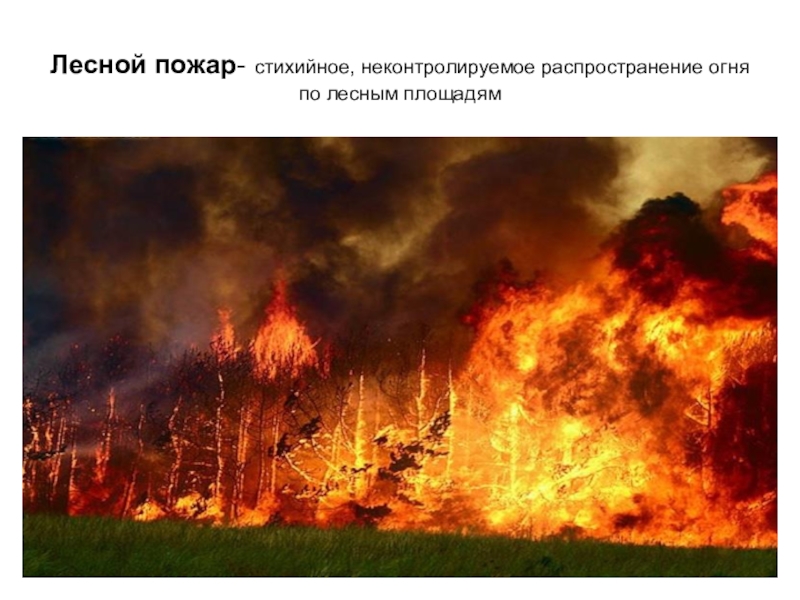 Слайд 36Лесной пожар- стихийное, неконтролируемое распространение огня по лесным площадям
