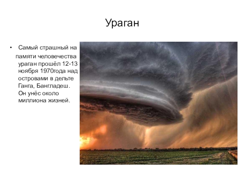 ураган прошёл 12-13 ноября 1970года над островами в дельте Ганга, Бангладеш. Он унёс около миллиона жизней.