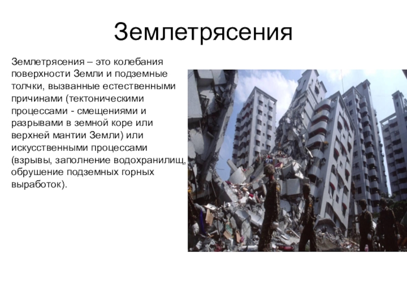 поверхности Земли и подземные толчки, вызванные естественными причинами (тектоническими процессами - смещениями и разрывами в земной коре или верхней мантии Земли) или искусственными процессами (взрывы, заполнение водохранилищ, обрушение подземных горных выработок).