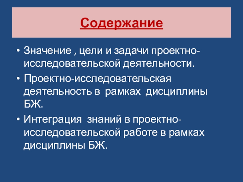 СодержаниеЗначение , цели и задачи проектно-исследовательской деятельности.Проектно-исследовательская деятельность в рамках дисциплины БЖ.Интеграция знаний в проектно-исследовательской работе в рамках дисциплины БЖ.