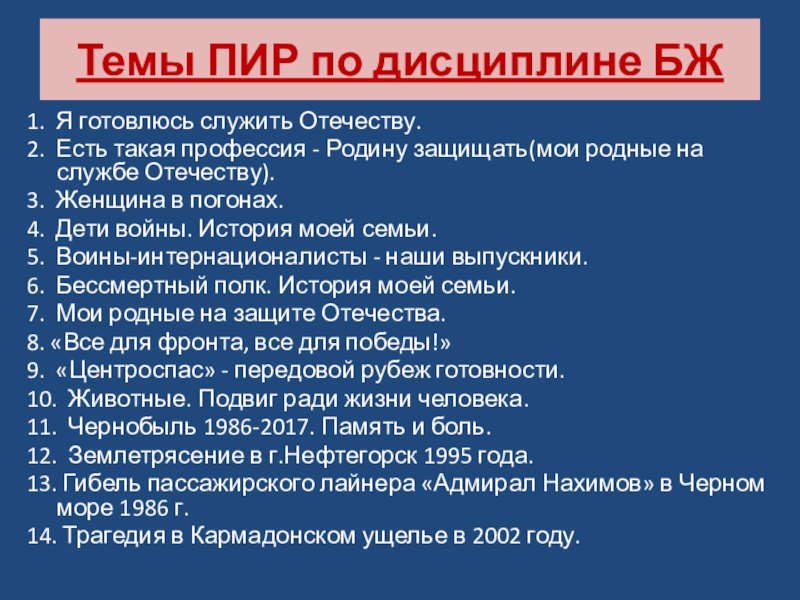 Темы ПИР по дисциплине БЖ1. Я готовлюсь служить Отечеству.2. Есть такая профессия - Родину защищать(мои родные на