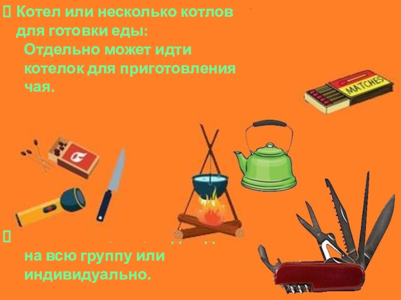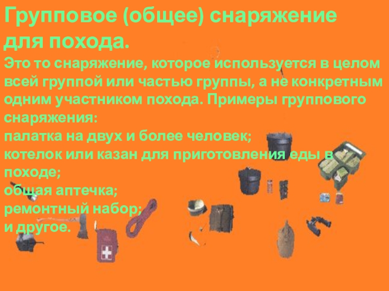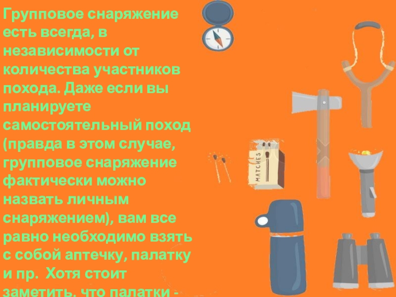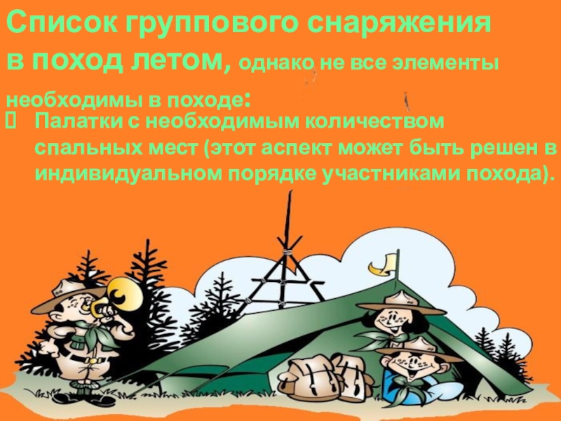 Палатки с необходимым количеством спальных мест (этот аспект может быть решен в индивидуальном порядке участниками похода).