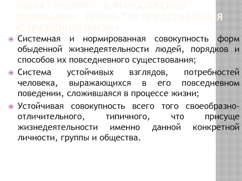 Система устойчивых взглядов, потребностей человека, выражающихся в его повседневном поведении, сложившаяся в процессе жизни;