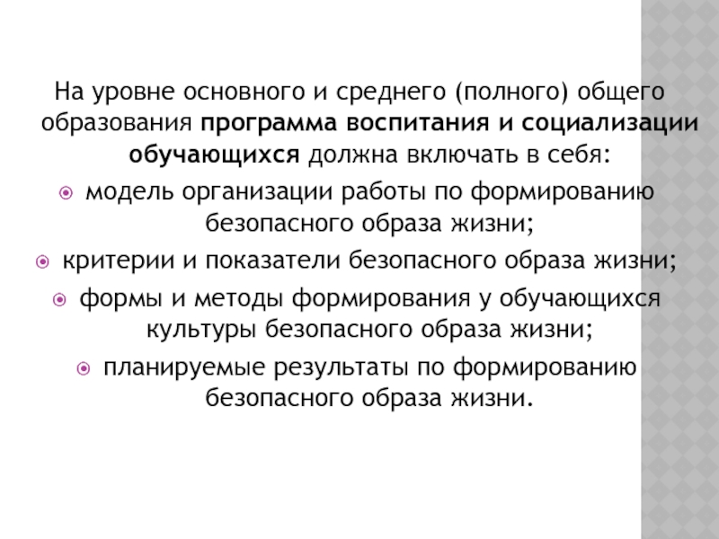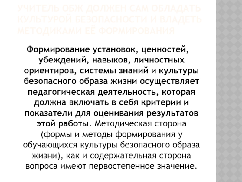 Формирование установок, ценностей, убеждений, навыков, личностных ориентиров, системы знаний и культуры безопасного образа жизни осуществляет педагогическая деятельность, которая должна включать в себя критерии и показатели для оценивания результатов этой работы. Методическая сторона (формы и методы формирования у обучающихся культуры безопасного образа жизни), как и содержательная сторона вопроса имеют первостепенное значение.