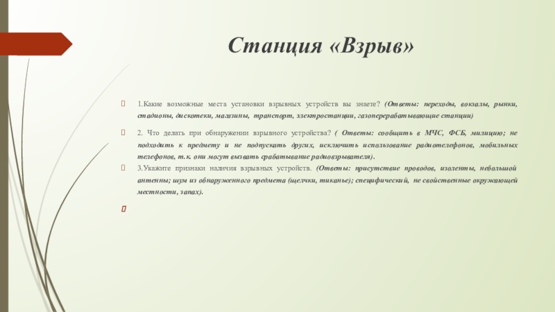 2. Что делать при обнаружении взрывного устройства? ( Ответы: сообщить в МЧС, ФСБ, милицию; не подходить к предмету и не подпускать других, исключить использование радиотелефонов, мобильных телефонов, т.к. они могут вызвать срабатывание радиовзрывателя).