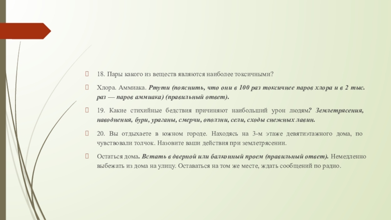 17. При аварии на химически опасном объекте произошла утечка хлора. Вы можете оказаться в зоне заражения, живете на 1-м этаже девятиэтажного дома. Как поступите? Укроетесь в подвале здания. Поднимитесь на верхний этаж (правильный ответ). Останетесь в своей квартире.